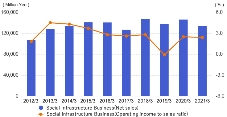 | Social Infrastructure Business(Net sales)(Million Yen) | 107,525 | 128,277 | 134,007 | 141,014 | 140,585 | 126,530 | 147,049 | 137,532 | 146,074 | 134,041 |