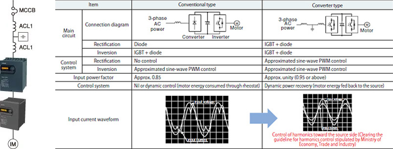 (measures taken against harmonics and noise) and energy saving (improvement of power factor).