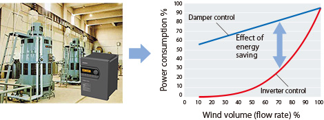 When inverter control is adopted for fans and pumps, a great effect of energy saving can be attained compared to damper control.