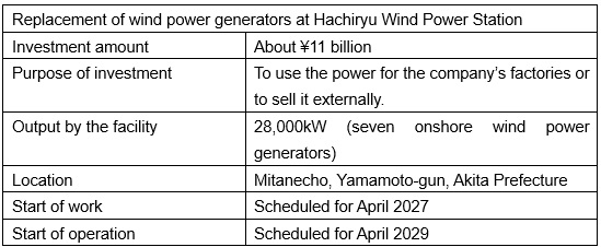 In the February 27, 2023 press release titled “Notification of the postponement of wind power station renewal,” Meidensha Corporation (“the company”) notified that M Winds Hachiryu Co., Ltd., a consolidated sub-subsidiary of the company, would postpone its project to renew the facilities at the Hachiryu Wind Power Station in Mitanecho, Akita Prefecture. On March 30, 2026, the company’s Board of Directors decided, after reassessing the investment, to invest approximately ¥11 billion in the renewal described below.