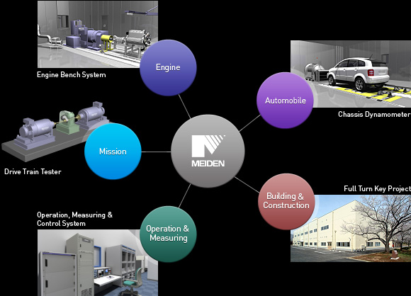 Meiden proposes various testing systems (for engines, power transmission, complete vehicles, etc.), automated driving operation for test, and operation & measurement system. In addition, we provide the full-turn-key construction of the plants such as test rooms, ancillary facilities, and experiment building.