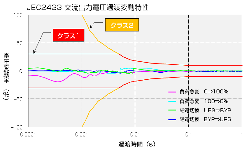 | Voltage transient variation Rapid change of input voltage (±10%) At power failure and recovery of commercial power source Rapid change of load (0⇔100%) Output switching (bypass⇔UPS) At parallel connection and removal (same setting time as above) |