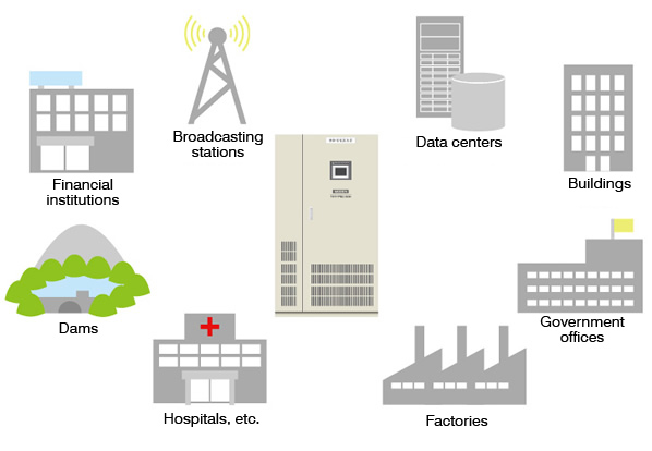 Our UPS is used in the important load facilities of various customers including financial services, broadcasting, government offices (prefectural office buildings and city halls), public facilities, data centers, and general buildings.