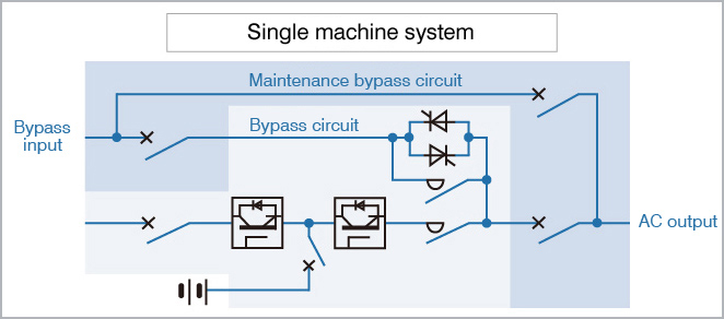 - During UPS inspection, power supply is continued to the load by the maintenance bypass circuit.