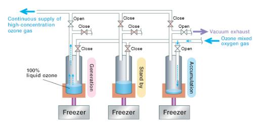 Meiden Pure Ozone Generator is a unit that liquefies and stores the ozone gas and supplies high-purity ozone gas continuously. Because of high purity ozone level, it can be used as an oxygen radical generation source for a semiconductor process. For safety, the unit has sufficient safety measures.