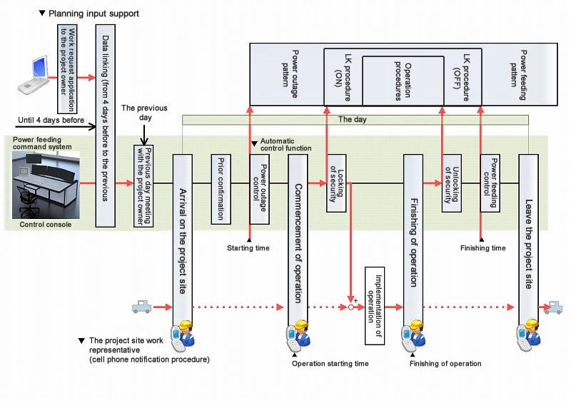 - By notifying the work status from the project site by cell phone (site arrival, work commencement, work completion, leaving the site), the system gets the update of the work progress on site, perform the timely interlock of related power equipment while the site work, and contributes to ensure safety.