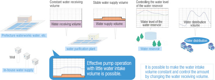 - Based on the predicted water supply demand volume, it stabilizes peak demand wave by using the buffer effect of the water reservoir. By stabilizing the every process of water intake, water feeding, water purification and water supply, it can produce the peak-shaving of energy and the power consumption.