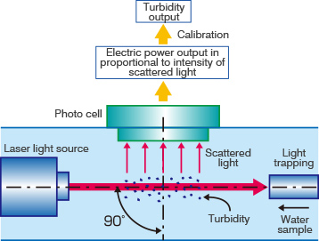 Low turbidity at 0.1 degrees can be measured with accuracy and longterm stability by adopting a side-way scattering system in which laser source is used as the measurement method.