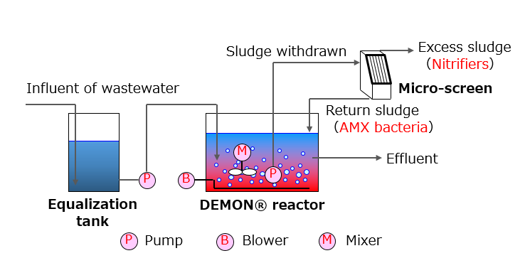 Sludge increases when nitrogen treatment is performed by the bacteria; however, the balance between metabolism of ammonium oxidizing bacteria(nitrifying bacteria) and AMX bacteria is maintained by selectively withdrawing nitrifying bacteria in the tank through a micro-screen. With this well-contrived treatment, stable and efficient nitrogen treatment can be achieved.