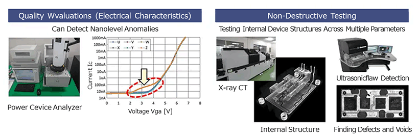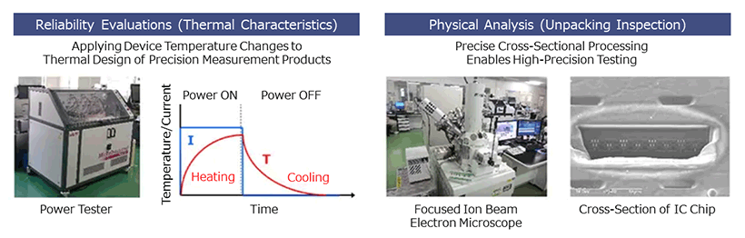 Meidensha uses a combination of non-destructive testing and physical analysis to evaluate and analyze the internal structure and characteristics of semiconductor devices used in products. Product reliability is ensured by using evaluation methods optimized to each device type and standard.